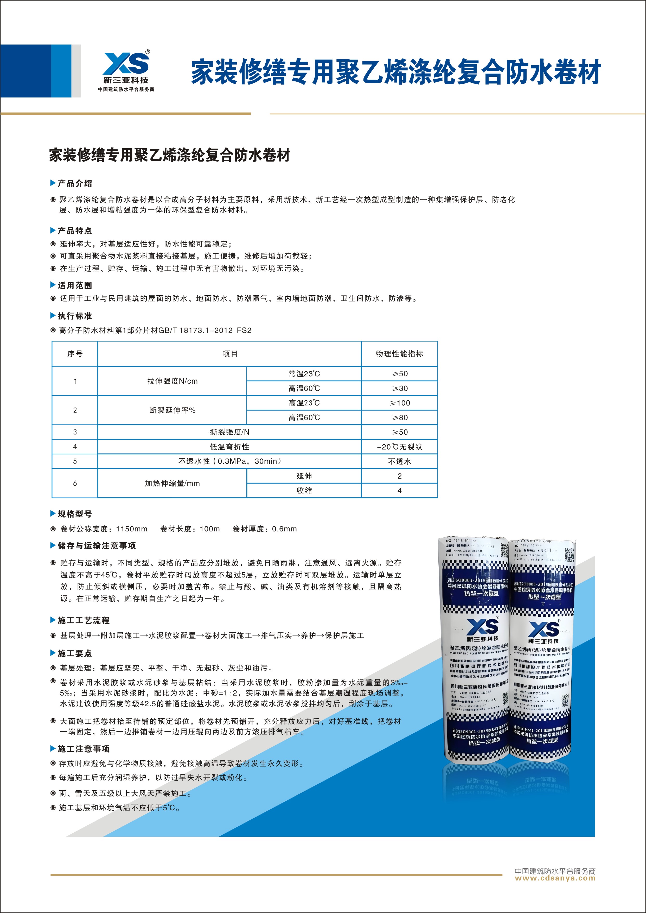 產(chǎn)品簡(jiǎn)介: 家裝修繕專用聚乙烯滌綸復(fù)合防水卷材是以合成高分子材料為主要原料,采用新技術(shù)、新工藝經(jīng)一次熱塑成型制造的一種集增強(qiáng)保護(hù)層、防老化層、防水層和增粘強(qiáng)度為一體的環(huán)保型復(fù)合防水材料。 規(guī)格:FS2-PE-50.0m*1.15m*0.60mm |