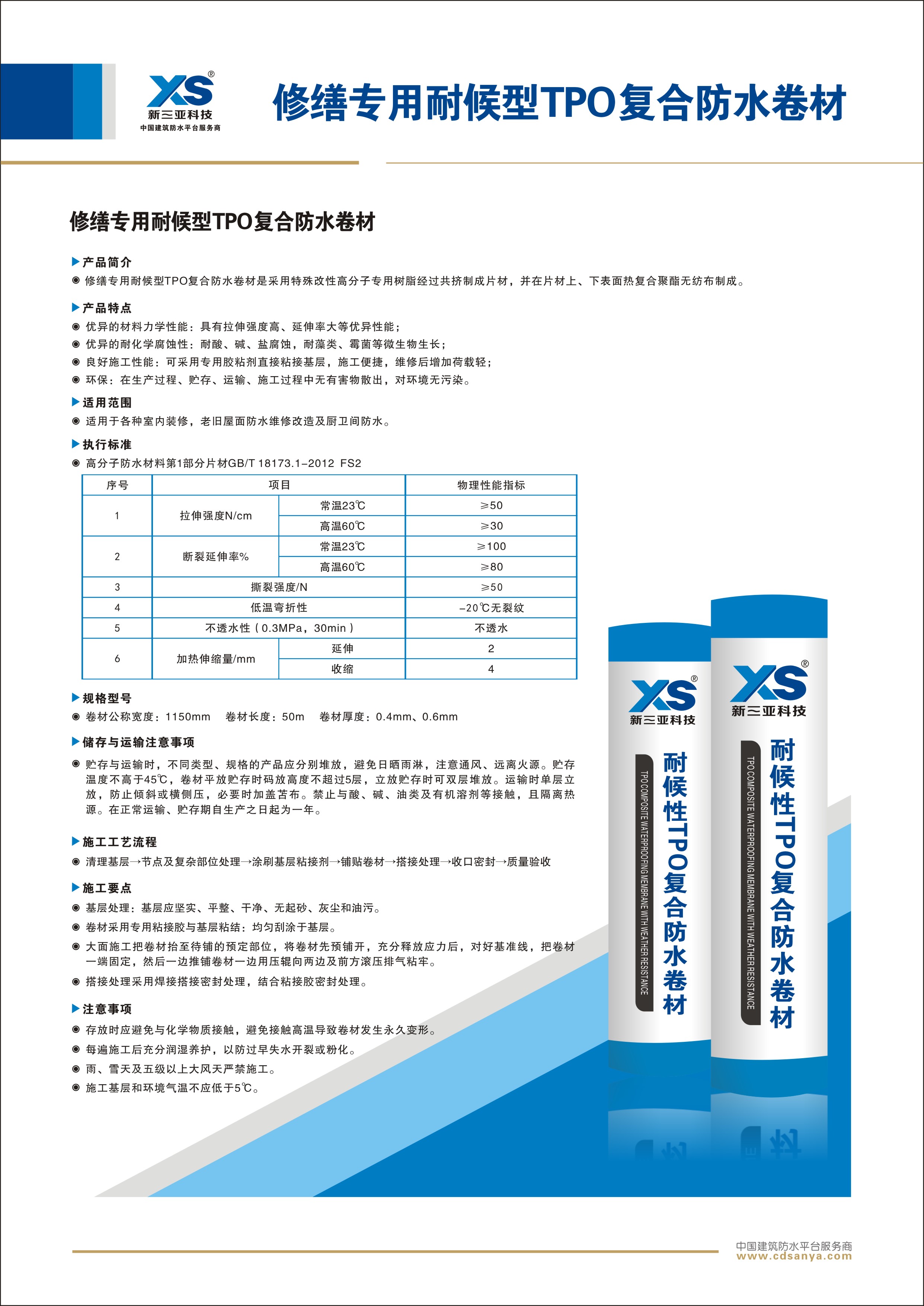 修繕專用耐候型TPO復合防水卷材是采用特殊改性高分子專用樹脂經過共擠制成片材,并在片材上、下表面熱復合聚酯無紡布制成。